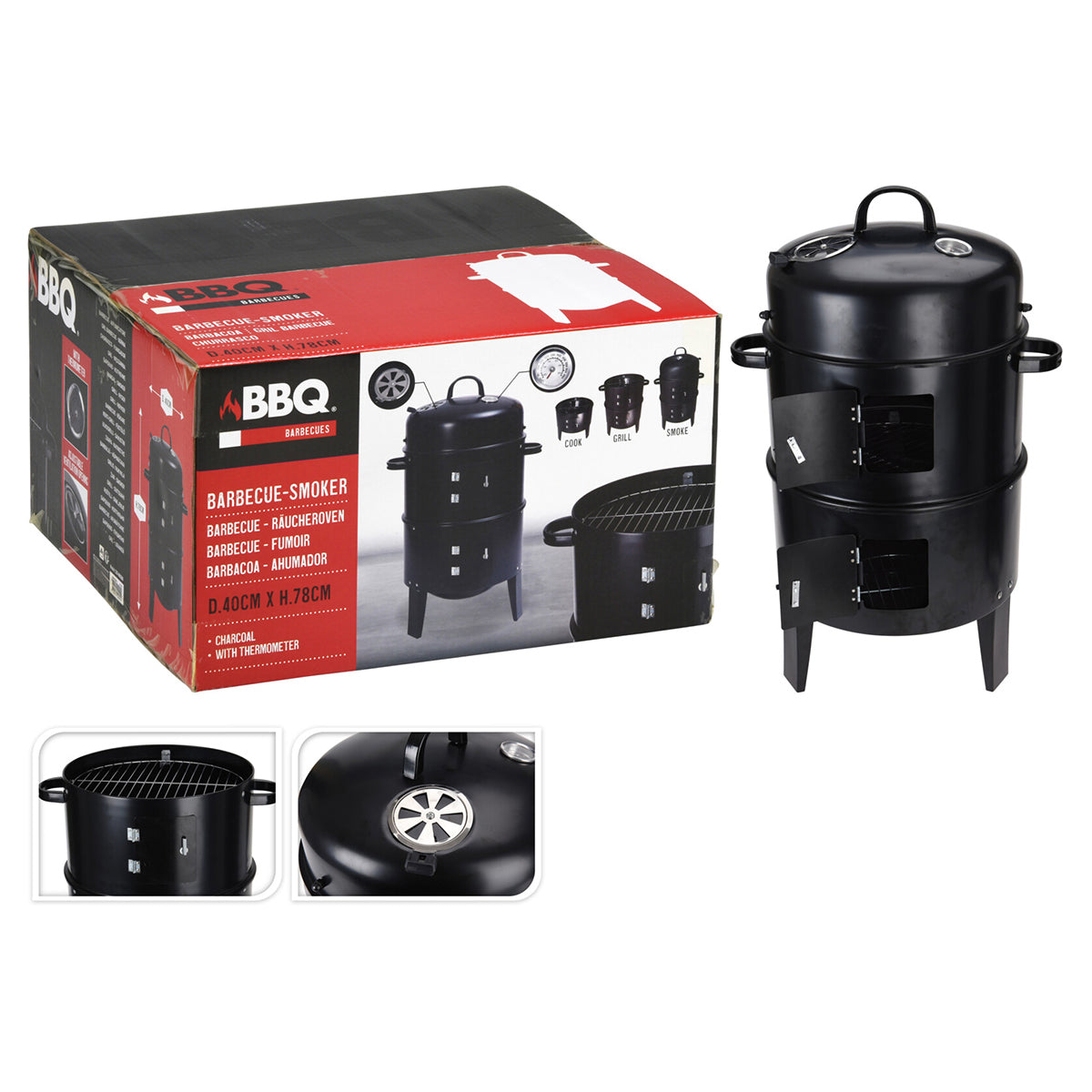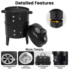 Ahumador barbacoa con parrilla de cocción, bandeja de carbón cromado, 3 patas anchas, termómetro y respiradero en la parte superior. Modelo de color negro.
