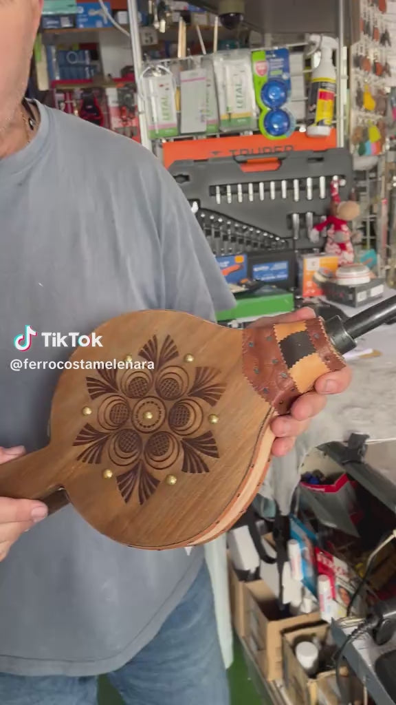 Fabricado en madera + guarnición de badana (piel - cuero) y skay. Boquilla de soplado en hierro. El propio fuelle es de piel con bordes decorativos en skay. Refuerzo metálico en el interior del fuelle para que no se encoja.