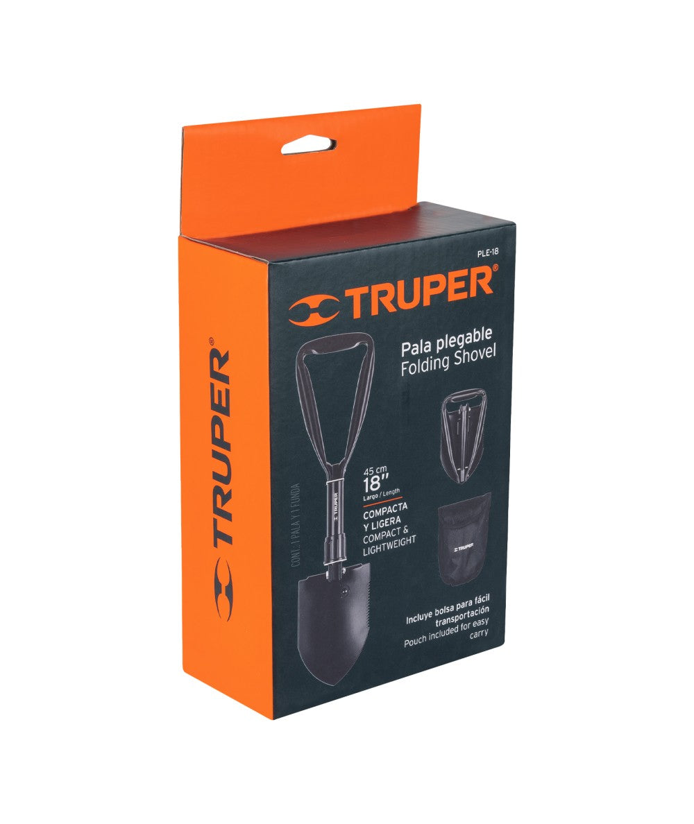 Pala plegable de acero con funda de poliéster y PVC para un fácil almacenaje. Pala multifuncional: pala, pico, azadón y sierra (lateral).