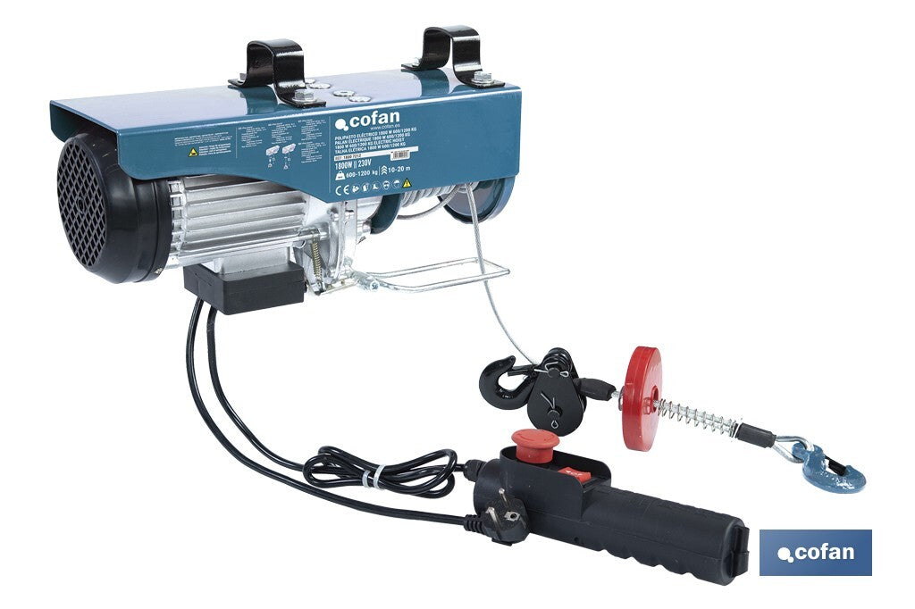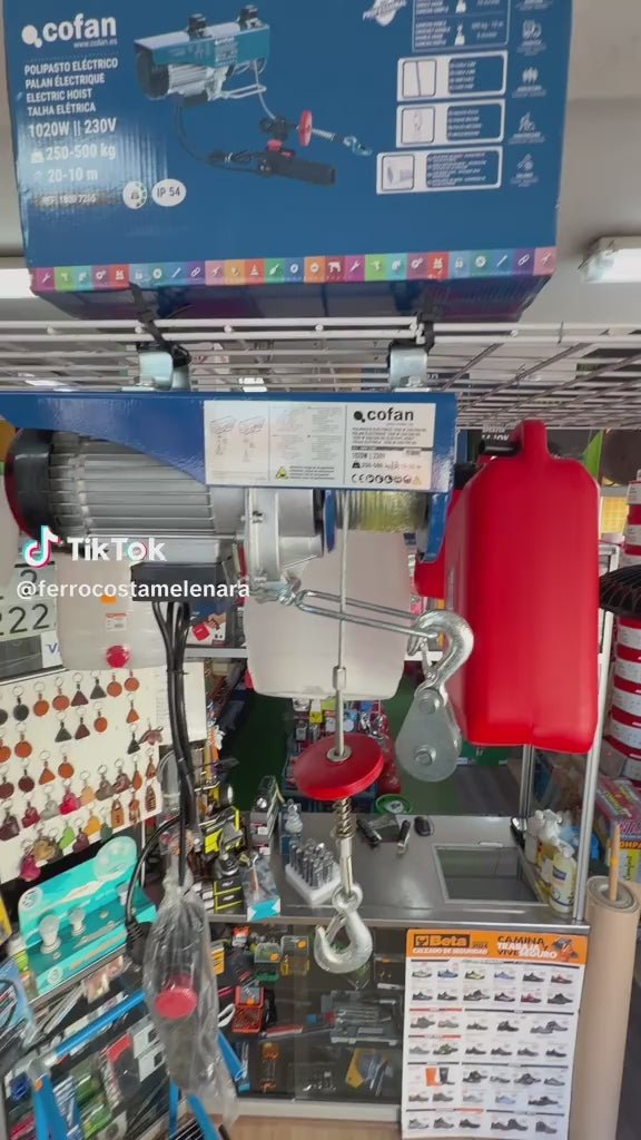 El polipasto eléctrico de 220 V ofrece una solución potente, segura y eficiente para la elevación de cargas en entornos industriales, agrícolas o de obra. Su diseño compacto y robusto, con un motor de alto rendimiento fabricado con materiales de primea calidad, permite trabajar con cargas de hasta 500 kg o 1200 kg, según la versión, a una altura máxima de hasta 20 metros, lo que lo convierte en una herramienta esencial para tareas de manipulación de materiales pesados, garantizando un funcionamiento duradero y eficaz durante la vida útil del polipasto. Equipado con un mando a distancia con interruptor de parada de emergencia, garantiza un control preciso y seguro durante todo el proceso de elevación. Además, incorpora un interruptor de frenado reforzado que mejora la retención de la carga y evita deslizamientos accidentales. Gracias a su dispositivo de protección térmica integrado, el motor está protegido contra sobrecalentamientos, alargando su vida útil incluso en condiciones de trabajo exigentes. Su clase de protección IP54 lo resguarda del polvo y de salpicaduras de agua. Este polipasto, disponible en dos capacidades de carga diferentes: 250/500 kg y 600/1200 kg, ofrece una solución ideal para elevar cargas medias de forma profesional y segura.